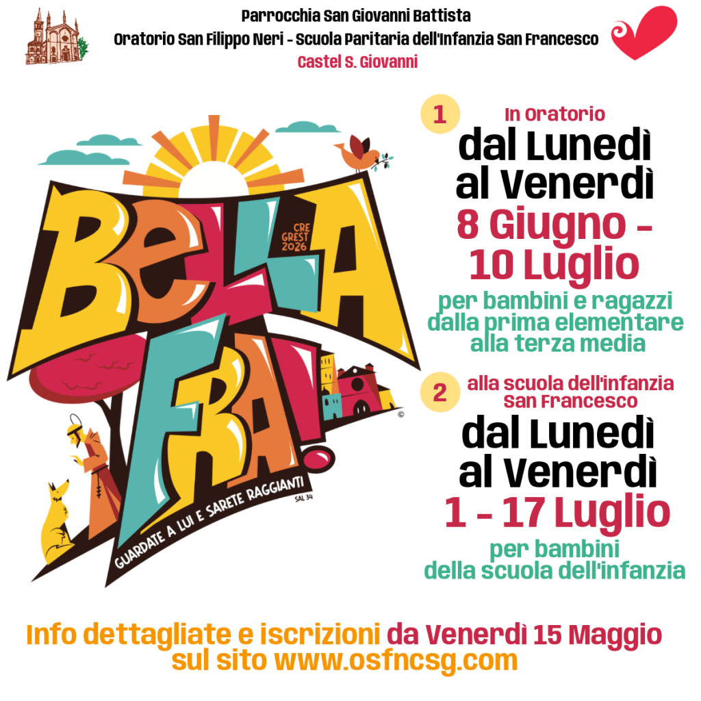 BELLA FRA! prende spunto dal saluto dei più giovani, da un modo fraterno di battersi il pugno, di darsi la mano che dice di una gioia nel rivedersi, nel ritrovarsi, nello stare insieme. E questo è quello che vogliamo dirci tra noi al Cre-Grest, contenti di vivere un’esperienza di fraternità e desiderosi di dire anche a San Francesco, facendolo diventare compagno di avventura, fratello! “Guardate a lui e sarete raggianti”, invece, è un versetto del Salmo 34 che si fa augurio per i nostri Cre-Grest perché guardandoci, possano vederci raggianti perché capaci di essere Luce di Dio nel mondo.