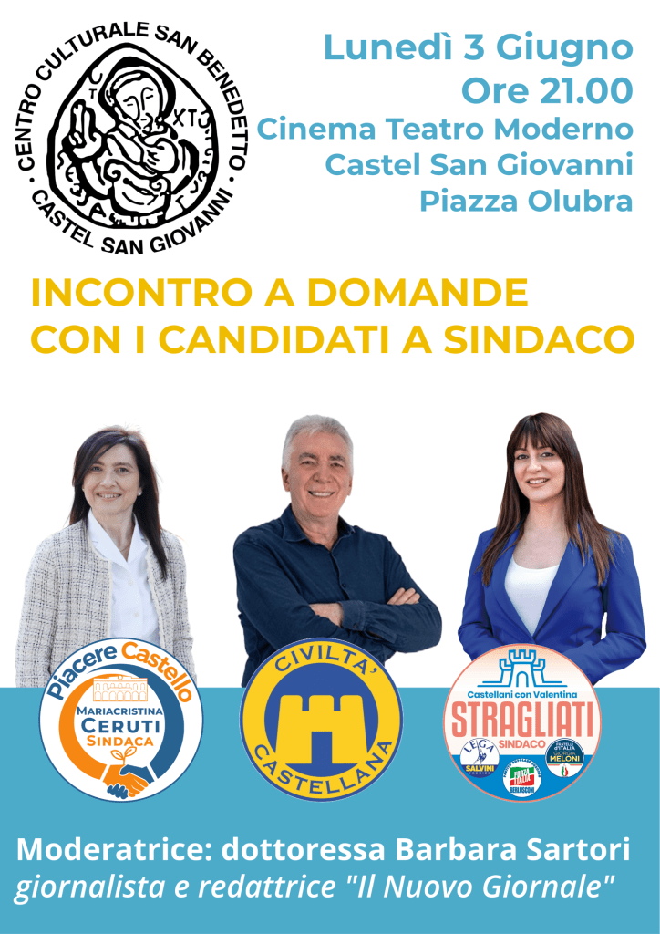 Il centro culturale San Benedetto invita ad un incontro con i tre candidati, Lunedì 3 Giugno alle ore 21.00, presso il Cinema Teatro Moderno di Castel San Giovanni.