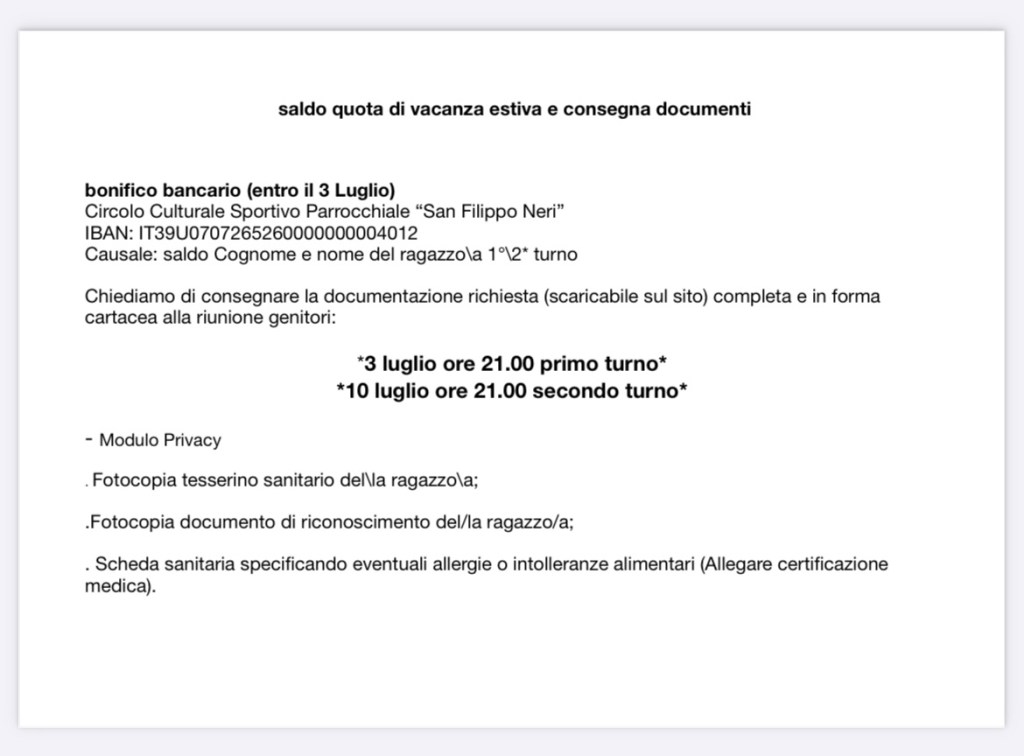 – Portare alla riunione genitori, nelle seguenti date, alle ore 21.00 in Oratorio, i documenti sotto indicati.