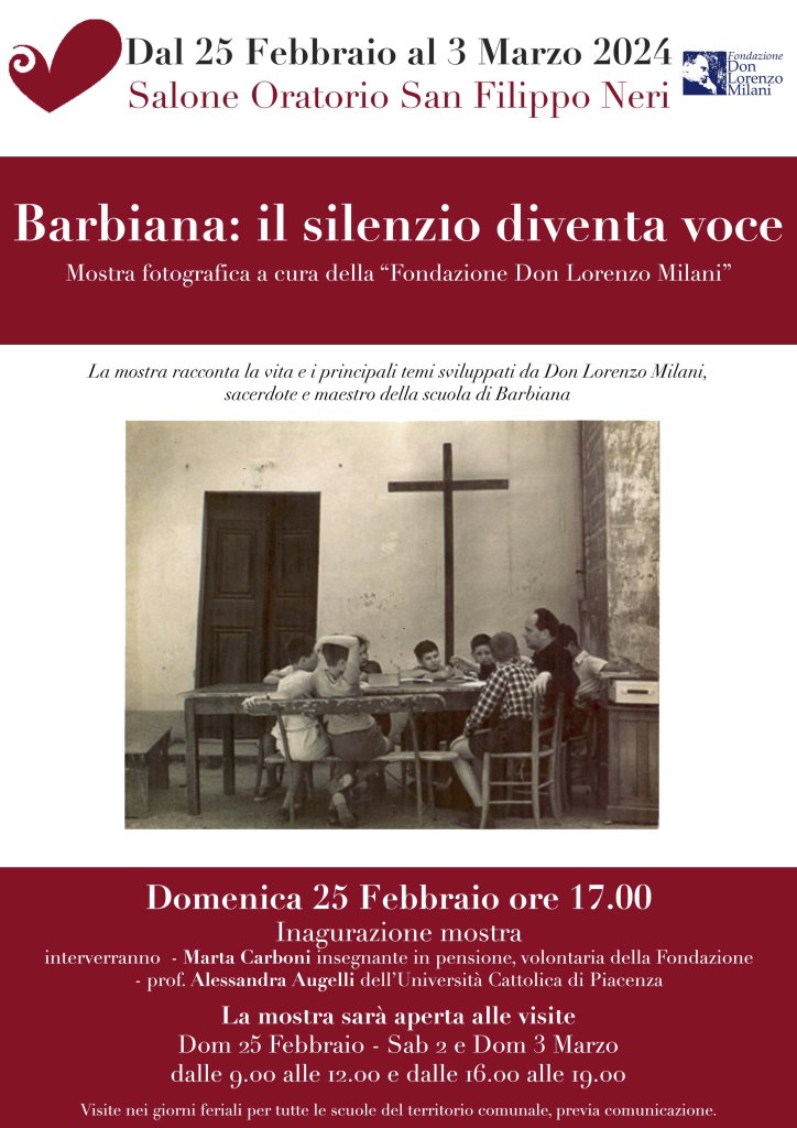 Domenica 25 Febbraio ore 17.00 Inagurazione mostra interverranno – Marta Carboni insegnante in pensione, volontaria della Fondazione prof. Alessandra Augelli dell’Università Cattolica di Piacenza