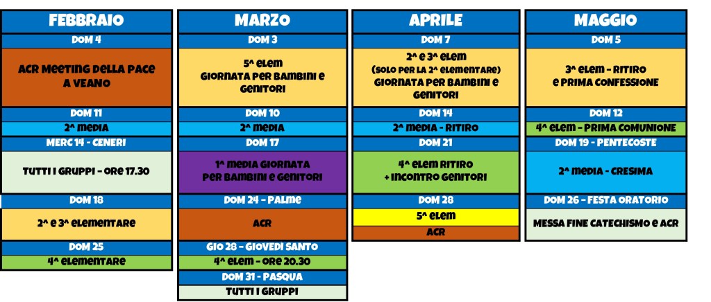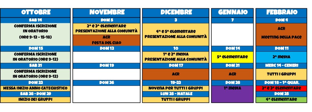 I gruppi di Catechismo vivono la loro esperienza tutti i sabati mattina, dalle 10.30 alle 11.30, mentre l’ACR propone i suoi incontri ogni domenica mattina, dalle 11.00 alle 12.00. Quest’ultima in particolare proporrà una domenica al mese (vedi calendario) dove far vivere ai ragazzi aderenti le tappe del cammino associativo, che quest’anno ha per tema “Questa è casa tua! – La cura del creato”.