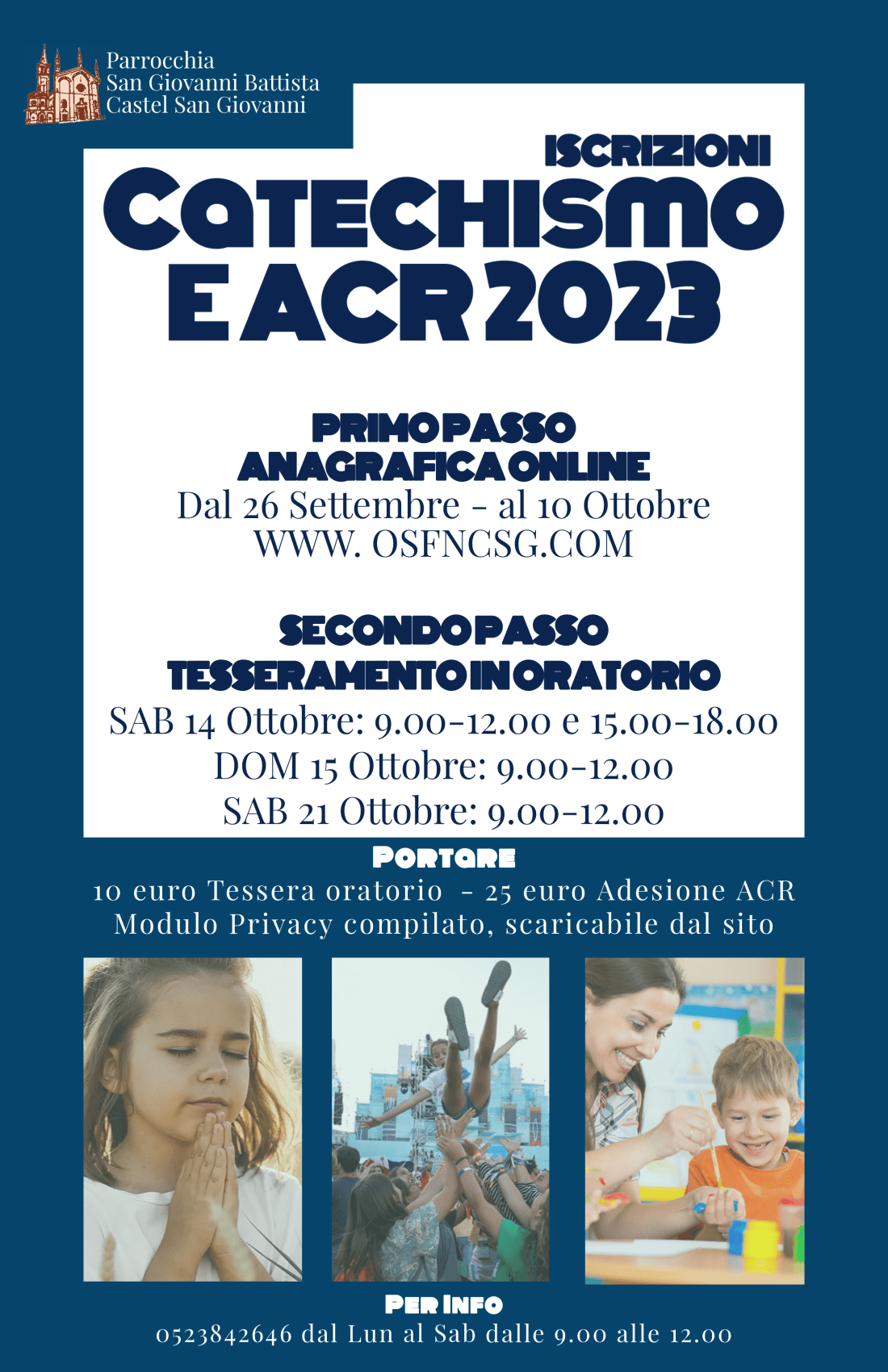 PER INFORMAZIONI: Segreteria parrocchiale 0523842646 dalle 9.00 alle 12.00 dal Lun al Sab
