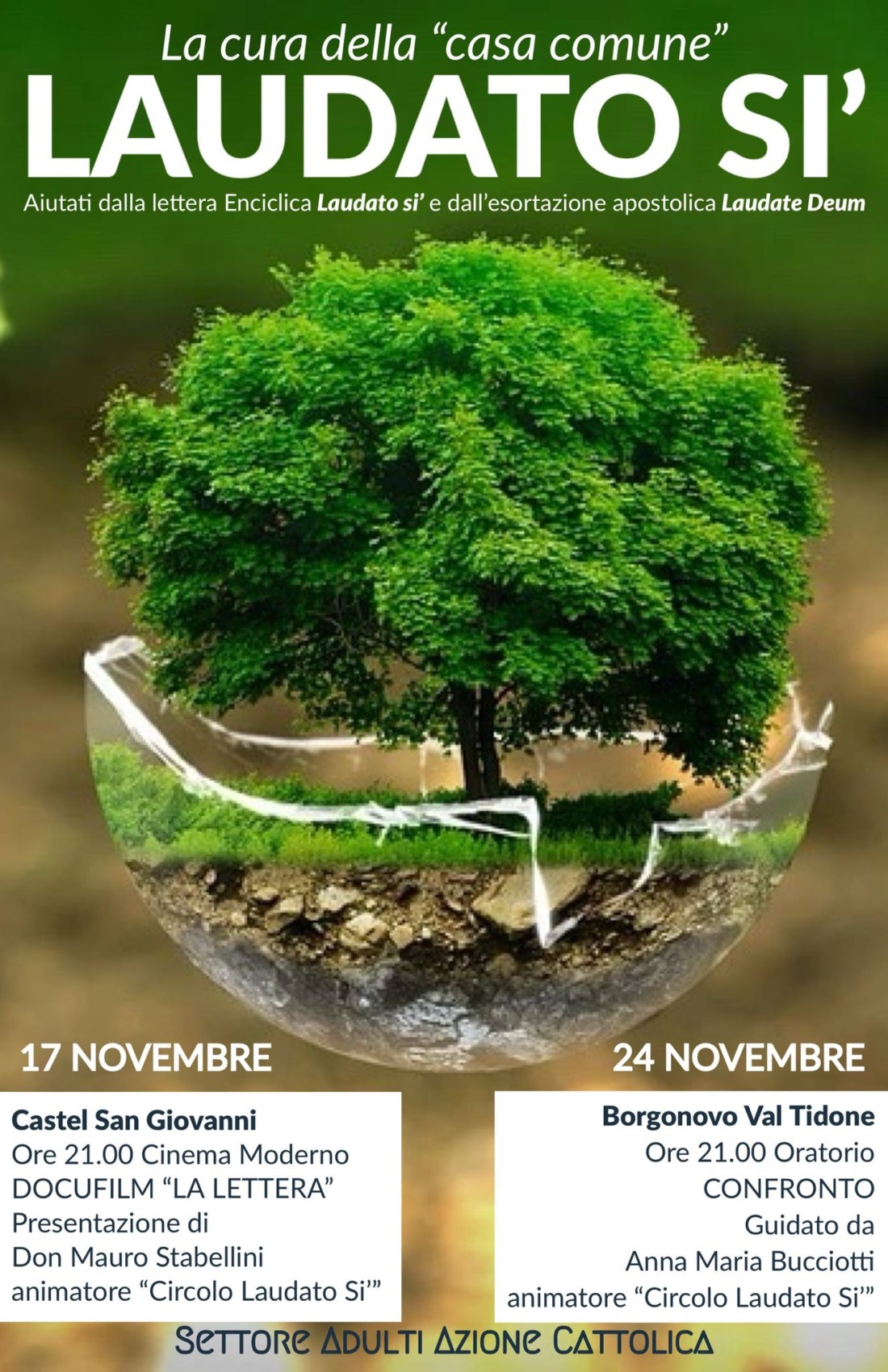 24 Novembre ore 21.00 Oratorio Borgonovo Val Tidone – Confronto guidato da Anna Maria Bucciotti membro “Circolo Laudato Si’”