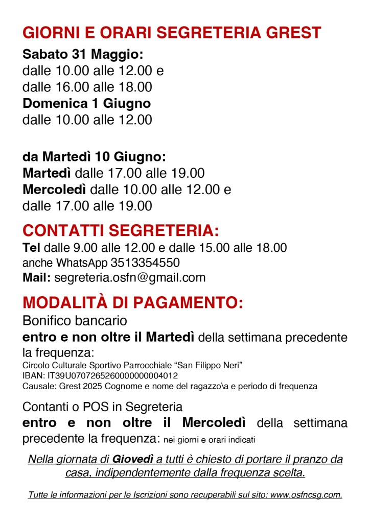 La partecipazione al Grest del bambino/ragazzo sarà possibile dal lunedì successivo l’avvenuta iscrizione;