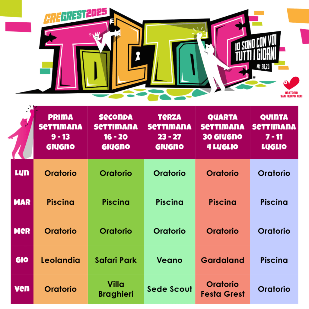 L’iscrizione al Grest, per motivi di sicurezza, è settimanale e di conseguenza non è prevista un’iscrizione giornaliera o a giorni alterni;
