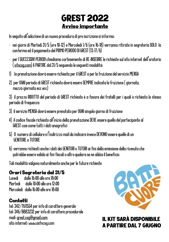 1. la prenotazione dovrà essere richiesta per il GREST e per la fruizione del servizio MENSA
