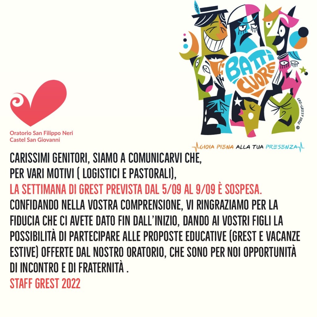 Grest aprirà il 13 Giugno e chiuderà il 22 Luglio,