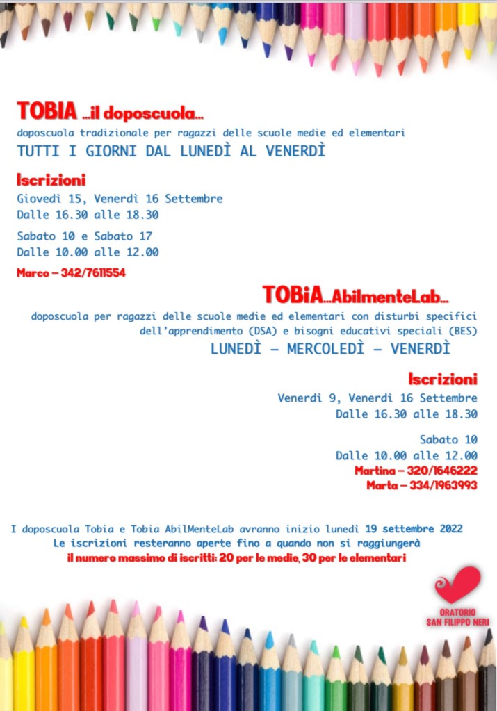 I doposcuola Tobia e Tobia AbilMenteLab avranno inizio lunedì 19 settembre 2022 Le iscrizioni resteranno aperte fino a quando non si raggiungerà