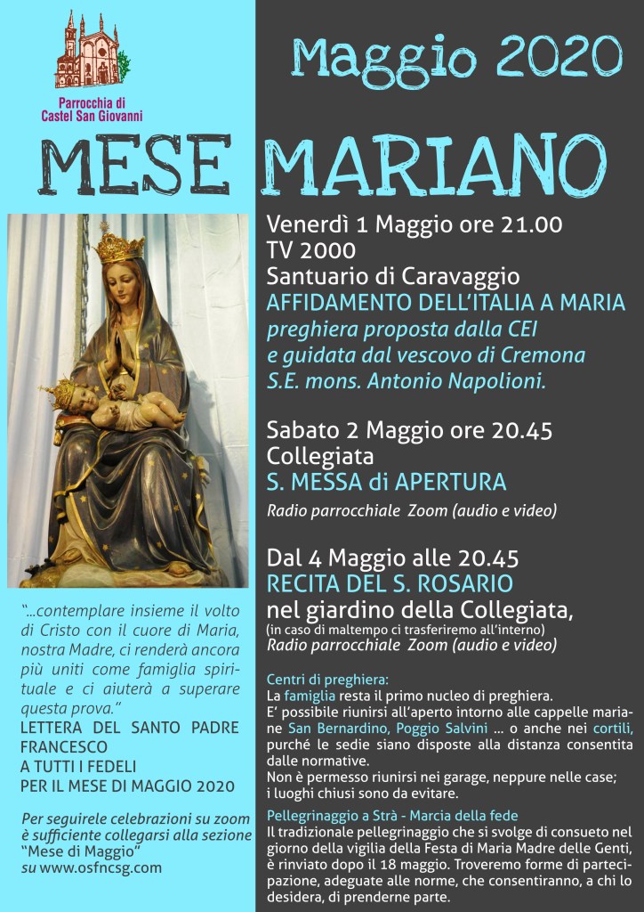 Centri di preghiera: La famiglia resta il primo nucleo di preghiera. E’ possibile riunirsi all’aperto intorno alle cappelle mariane San Bernardino, Poggio Salvini … o anche nei cortili, purché le sedie siano disposte alla distanza consentita dalle normative. Non è permesso riunirsi nei garage, neppure nelle case; i luoghi chiusi sono da evitare.