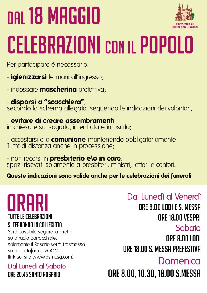 Nel pdf scaricabile trovate le modalità che consentiranno di partecipare alla S. Messa in collegiata, gli orari e lo schema per la disposizione in assemblea.