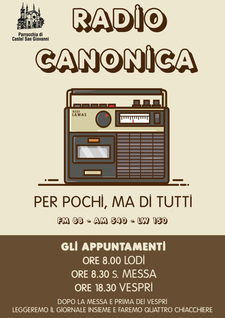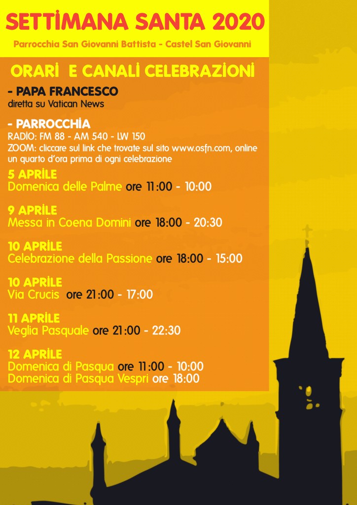 Da domenica 5 aprile (Domenica delle Palme), sarà possibile seguire attraverso la radio parrocchiale o tramite ZOOM i momenti di preghiera , le S. Messe e le celebrazioni proprie della Settimana Santa.