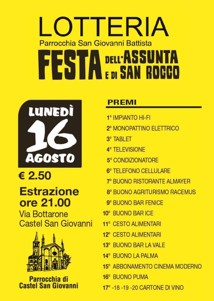 Torna la lotteria con ricchi premi. Biglietti in vendita in Canonica e presso Bar Ice – Libreria Puma – Ristorante Almayer – Merceria Bocedi – Bar Dalla Vale – Casaroli Abbigliamento – Caffetteria Mazzini – Civico 17.